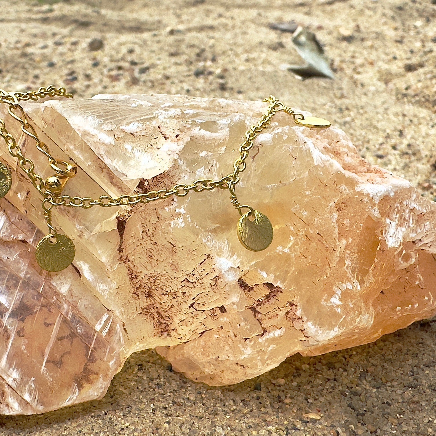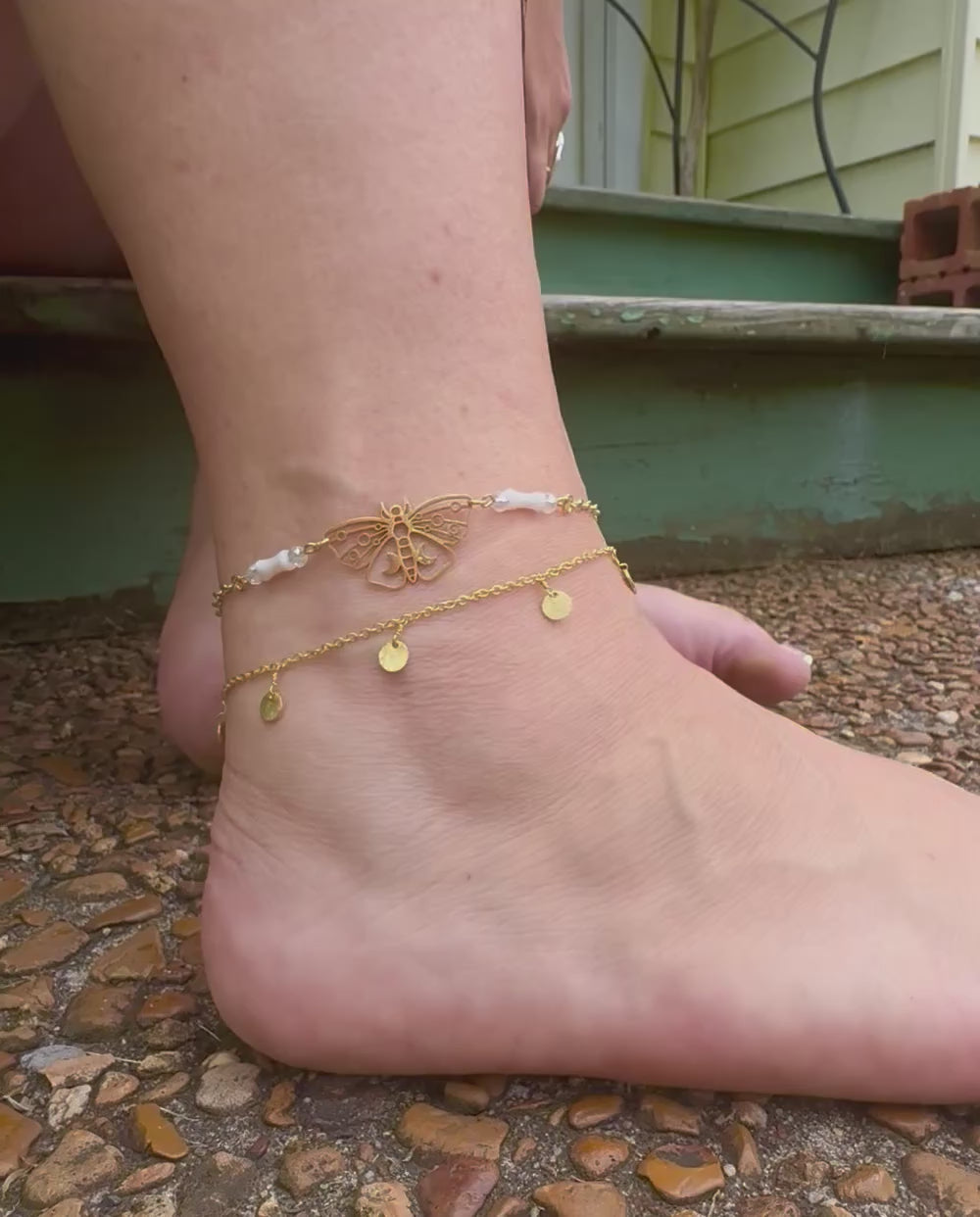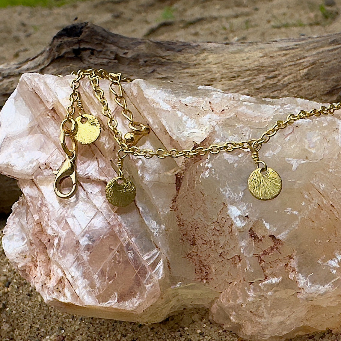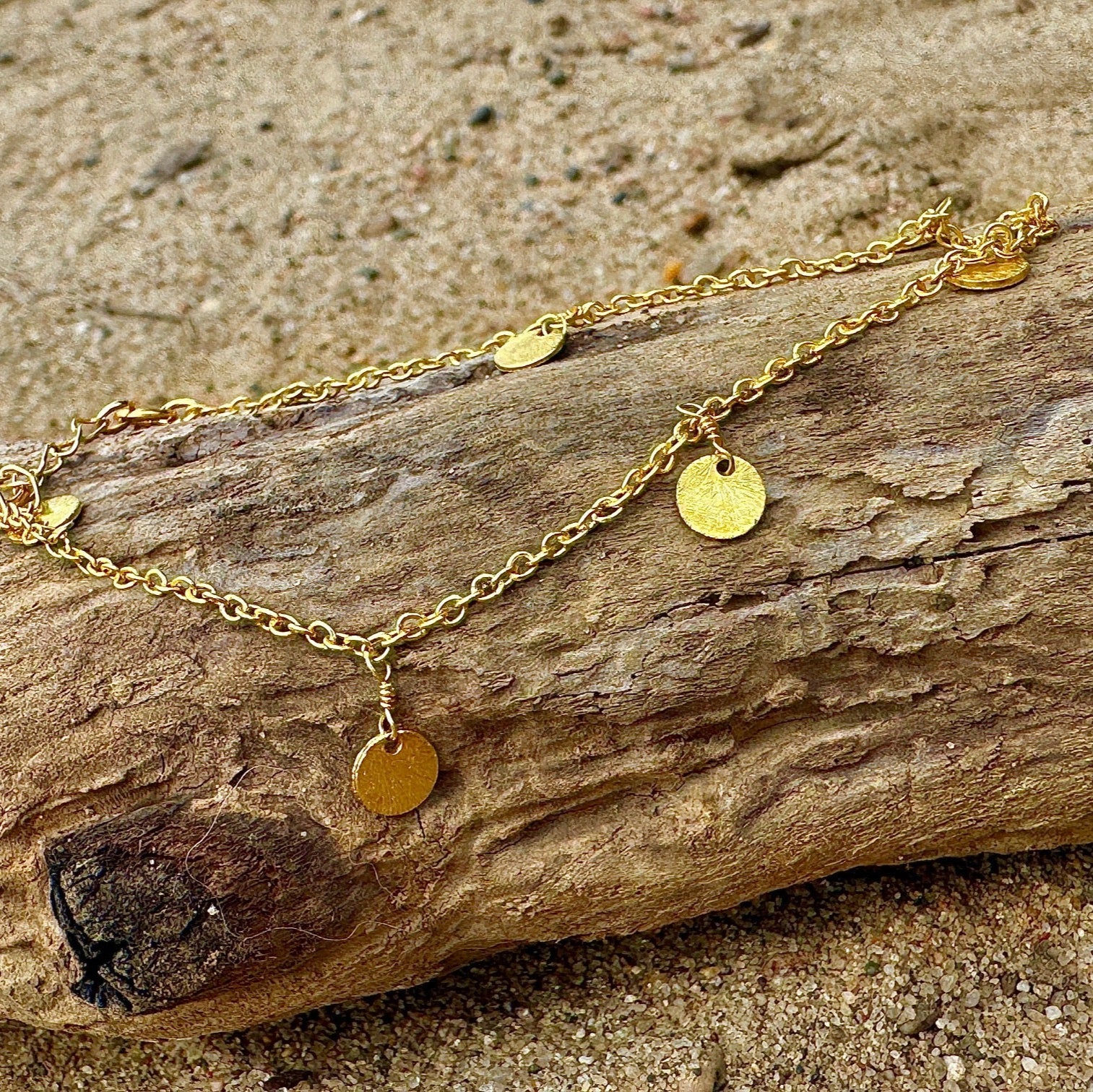 Summer is the time to show off those pretty feet and there's no better way to dress up those peds than wearing a anklet. This simply designed anklet will go through the summer with you, regardless of what you're wearing on any given day. All gold, thin chain with brushed gold coin tassels attached by wire, it's fun and flirty with a timeless design.
