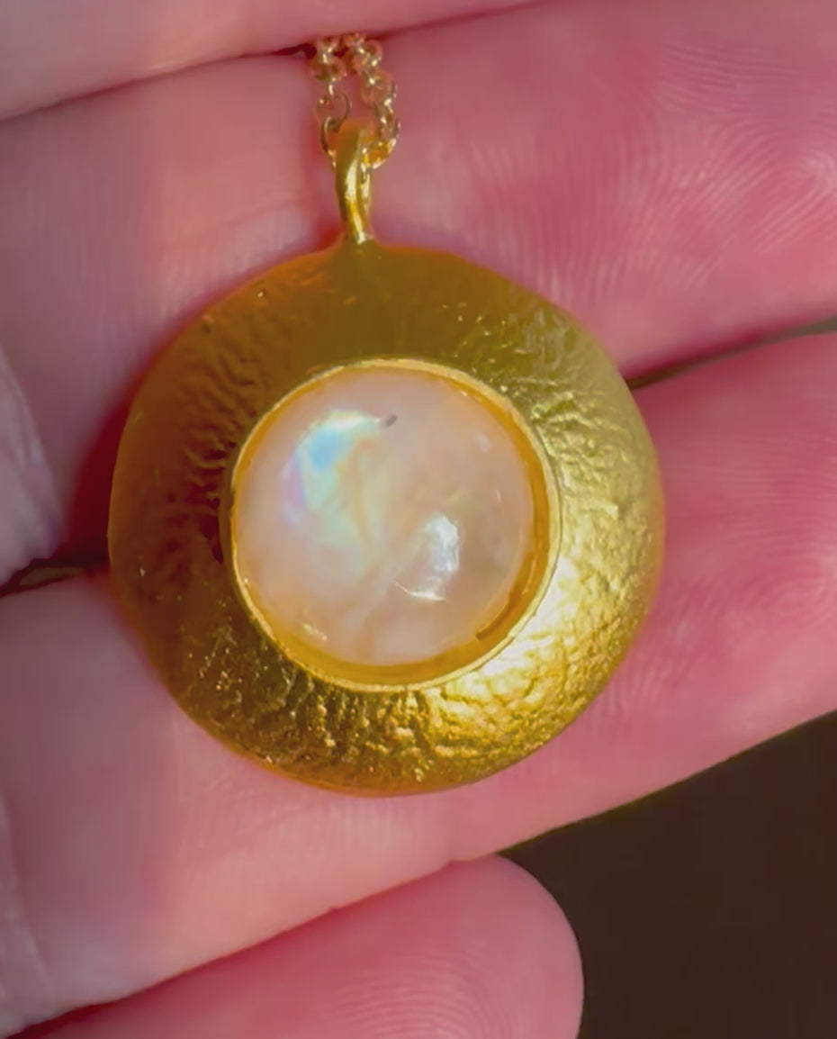 Illuminate your look with the stunning Moonstone Medallion Necklace. The Rainbow Moonstone at its center shimmers with mesmerizing blue flashes, making it the perfect focal point for this elegant piece. Set in a textured gold-plated brass bezel, the design's hammered metal texture adds a handmade, artisanal touch.